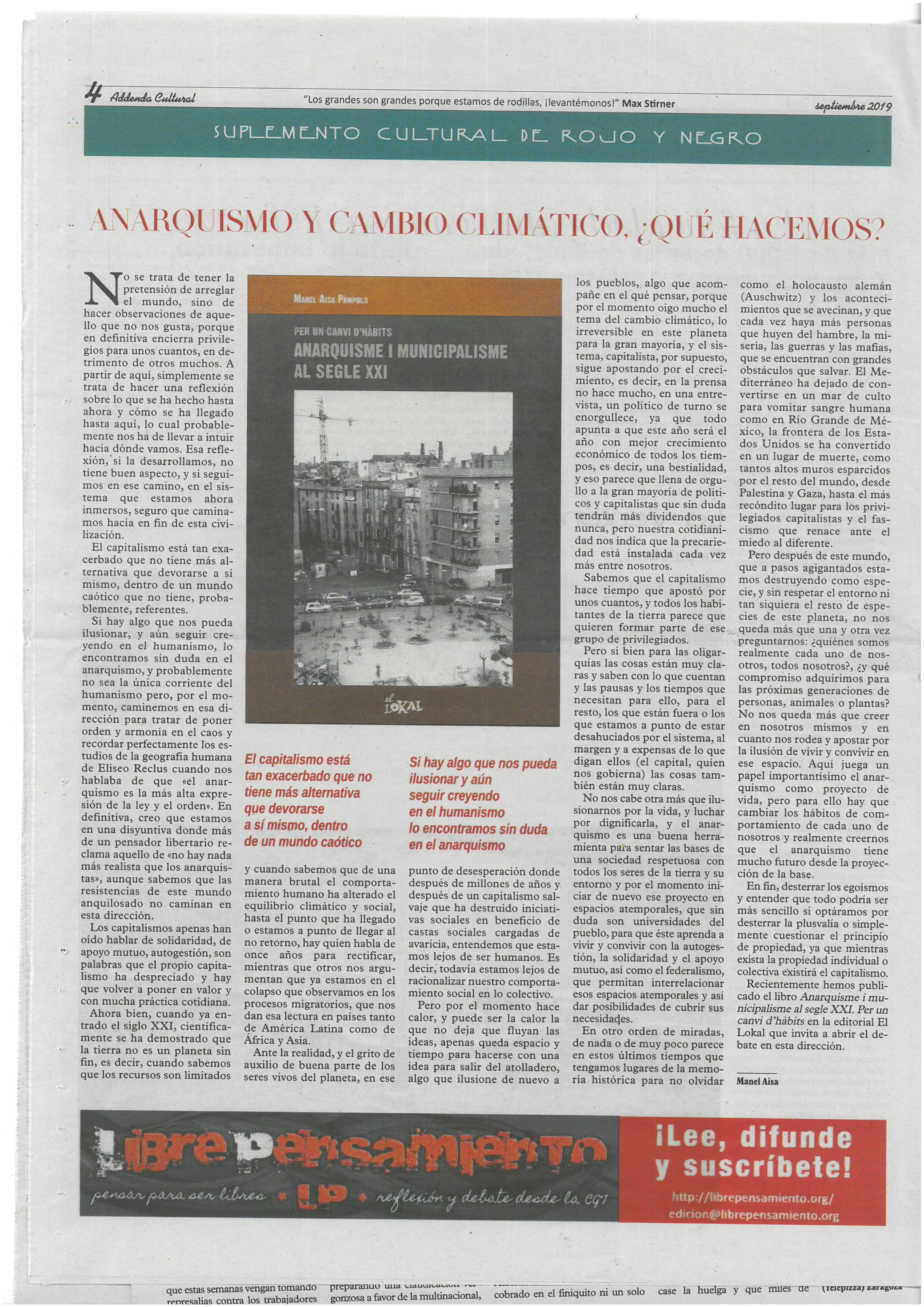 Anarquisme i Municipalisme al segle XXI, Per un Canvi d’Hàbits de Manel Aisa » rojo y negro 337 septiembre de 2019