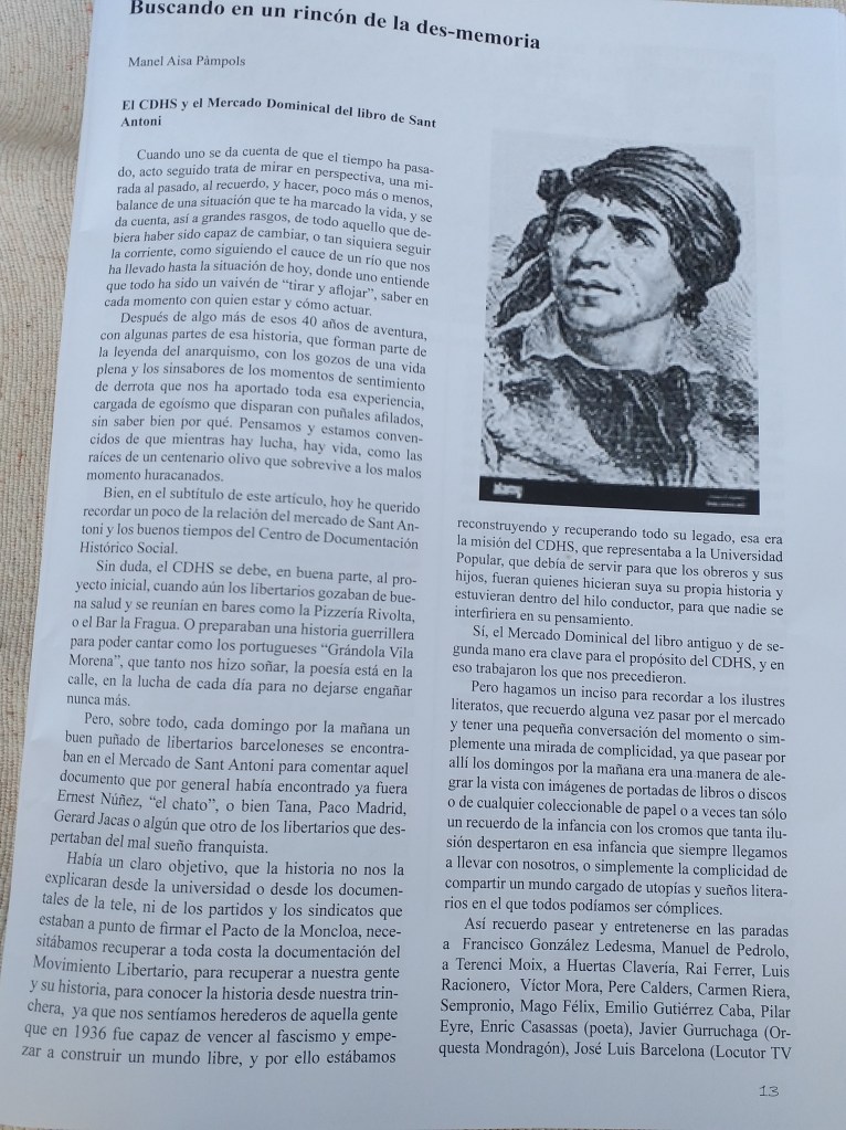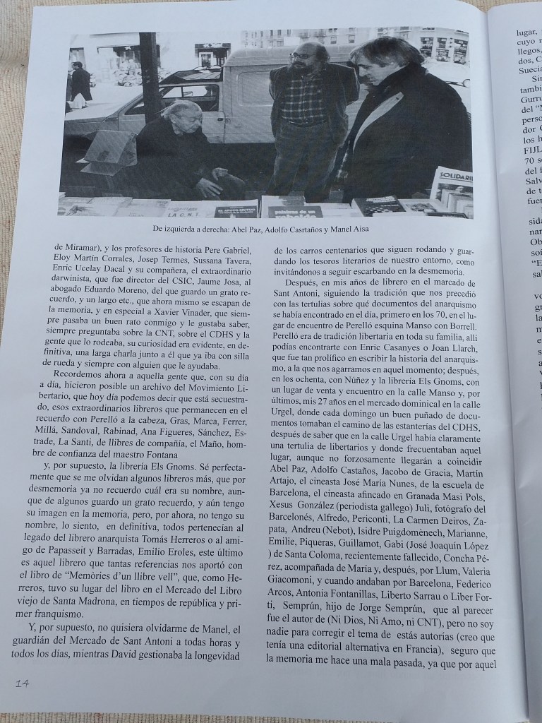 Después en mis años de librero en el marcado de Sant Antoni siguiendo la tradición que nos precedió con las tertulias sobre qué documentos del anarquismo se había encontrado en el día, primero en los 70 en el lugar de encuentro de Perelló esquina Manso con Borrell, Perelló era de tradición libertaria en toda su familia, allí podías encontrarte con Enric Casanyes o Joan Llarch que fue tan prolífero en escribir la historia del anarquismo a la que nos agarramos en aquel momento, después en los ochenta con Núñez y la librería els Gnoms, con un lugar de venta y encuentro en la calle Manso y por últimos mis 27 años en el mercado dominical en la calle Urgel, donde cada domingo un buen puñado de documentos tomaban el camino de las estanterías del CDHS, después saber que en la calle Urgel había claramente una tertulia de libertarios y donde frecuentaban aquel lugar, aunque no forzosamente llegarán a coincidir Abel Paz, Adolfo Castaños, Jacobo de Gracia, Martín Artajo, el cineasta José María Nunes de la escuela de Barcelona, el cineasta afincado en Granada Masi Pols, Xesus González(periodista gallego) Juli fotógrafo del Barcelonés, Alfredo, Periconti, La Carmen Deiros, Zapata, Andreu(Nebot), Isidre Puigdomènech, Marianne, Emilie, Piqueras, Guillamot, Gabi (José Joaquín López )de Santa Coloma recientemente fallecido, Concha Pérez acompañado de María y después por Llum, Valeria Giacomoni y cuando andaban por Barcelona, Federico Arcos, Antonia Fontanillas, Liberto Sarrau o Liber Forti, Semprún hijo de Jorge Semprun que al parecer fue el autor de (Ni Dios, Ni Amo, ni CNT), pero no soy nadie para corregir, el tema de estás autorías, (creo que tenía una editorial alternativa en Francia) seguro que la memoria me hace una mala pasada, ya que por aquel lugar, pasaron muchos más, compañeros anarquistas que desconozco su nombre, andaluces, castellanos, gallegos, extremeños, Vascos, asturianos, de Estado Unidos, Canadá, México, Grecia, Francia, Italia, Alemania, Suecia, Inglaterra, Escocia, Dinamarca, etc.
