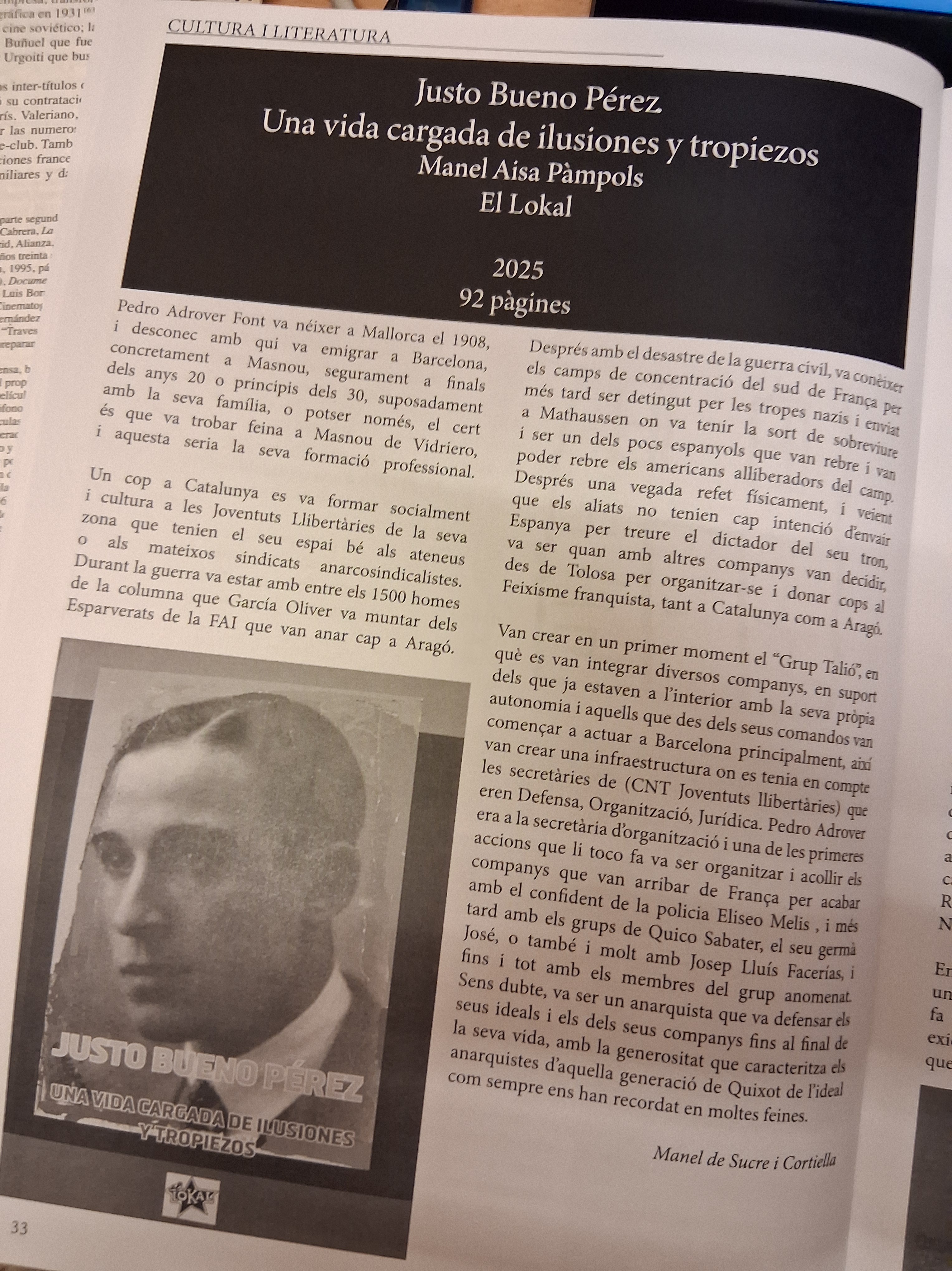 A la revista trobareu un bon grapat de articles i referències , notícies, etc. sobre l’anarquisme i entre tots ells la ressenya del llibre Justo Bueno Pérez Una vida cargada de ilusiones y tropiezos de Manel Aisa Pàmpols. Editat pel El Lokal , 2025 , 92 pàg. 9 euros.