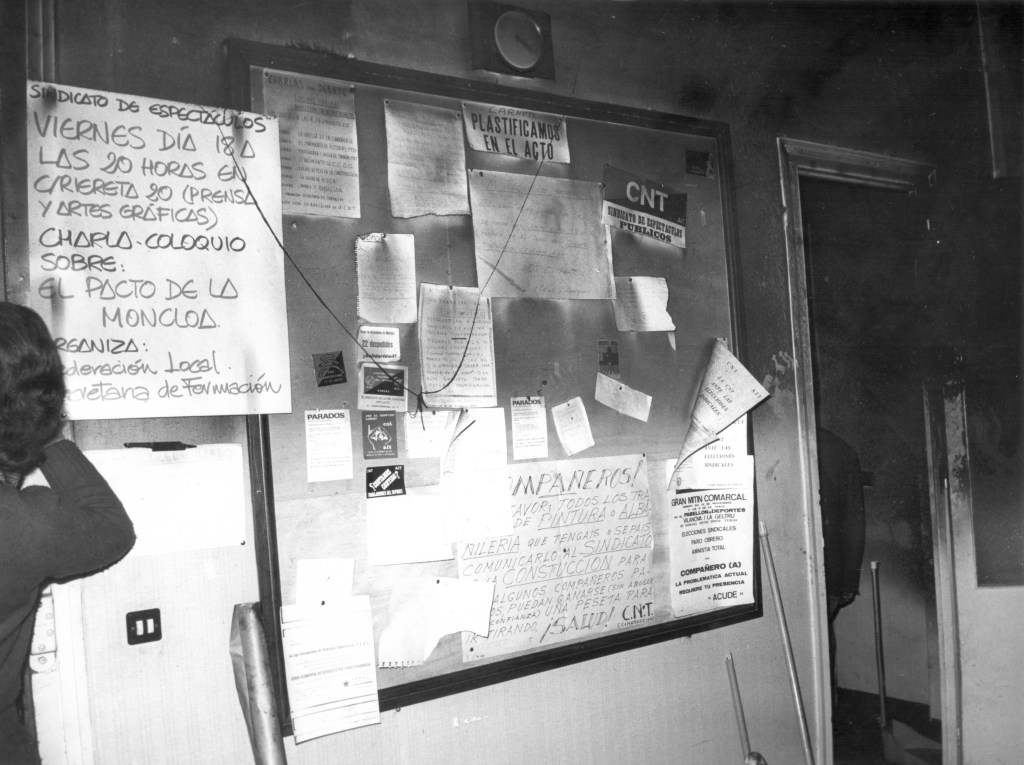En aquella época, junto con Cases, Torremocha, Sebas Puigcerver, nos dedicamos a visitar y buscar espacios para la CNT, yo ya había encontrado por mi cuenta el local de la calle Hospital 115 para el sindicato de la Construcción, y andábamos pintándolo a ratos libres con Luis Andrés Edo y un par de pintores que eran conocidos como “Madriles”, que alguno de ellos ya lo conocía de la infancia en el barrio chino, ya que vivía en la misma calle Cadena como yo.
