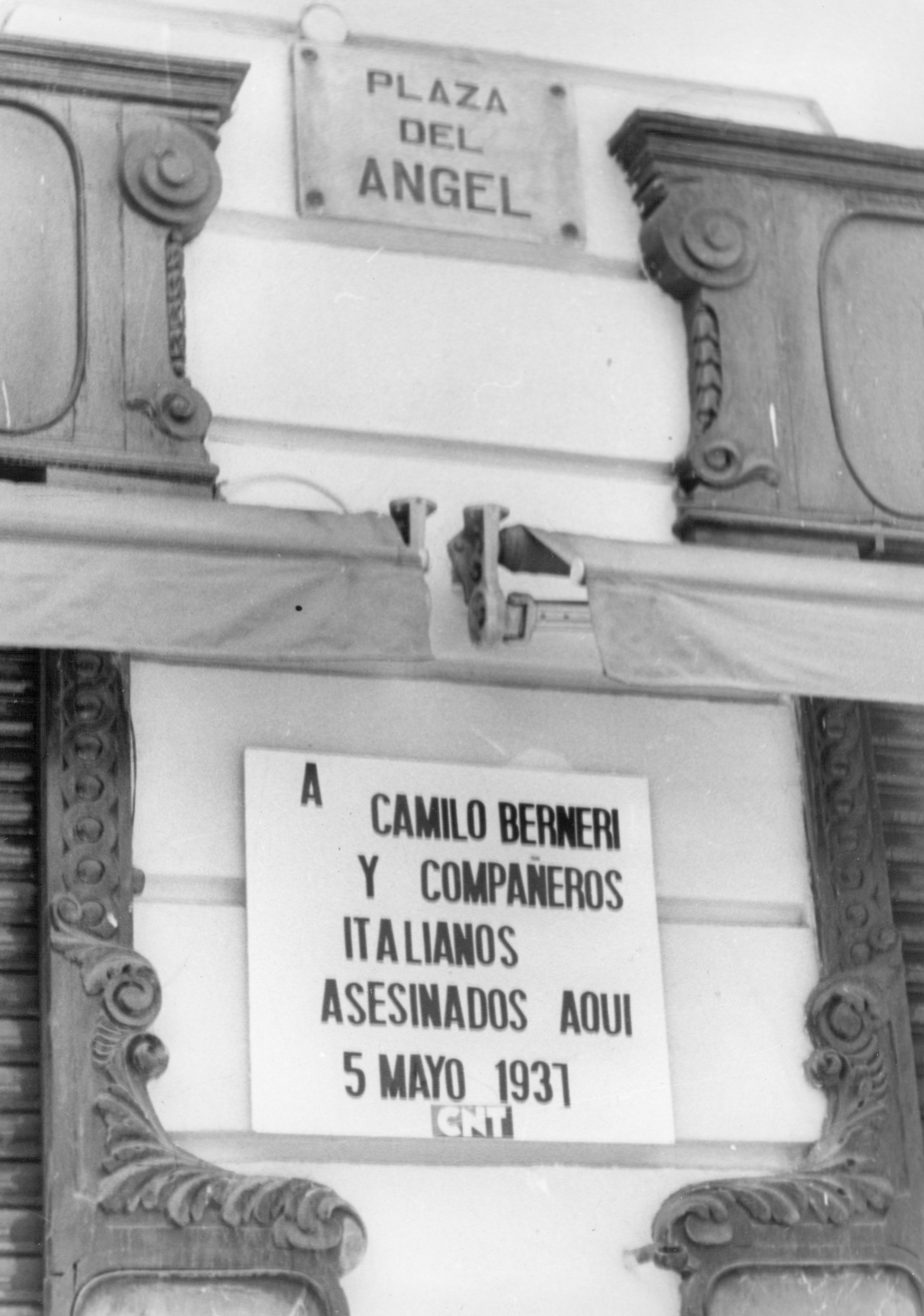 Otro de los acontecimientos del momento los encontramos en las tertulias que se organizaban en aquella época en la AISS de Vía Layetana, por lo general en aquellas tertulias que recuerdo alguna como la que se organizó sobre “Los hechos de Mayo del 37 ” donde participó el Centro de Documentación Histórico Social con su presidente Ernest Núñez dirigiendo el acto, al lado de Abel Paz, Manuel Cruells y Federica Montseny y Wilebaldo Solano. Y aprovechando aquel momento en la Plaza del Ángel, se puso una placa en recuerdo de Camilo Berneri, donde vivía en Barcelona el mayo de 1937, que era en la propia Plaza del Ángel, tocando a Vía Layetana, de donde salió detenido por los comunistas del PSUC que lo asesinaron, apareciendo su cuerpo días después, muy cerca del ayuntamiento de la ciudad, allí en ese acto de la colocación de la placa conocí a Balanski un anarquista búlgaro que andaba exiliado por París.