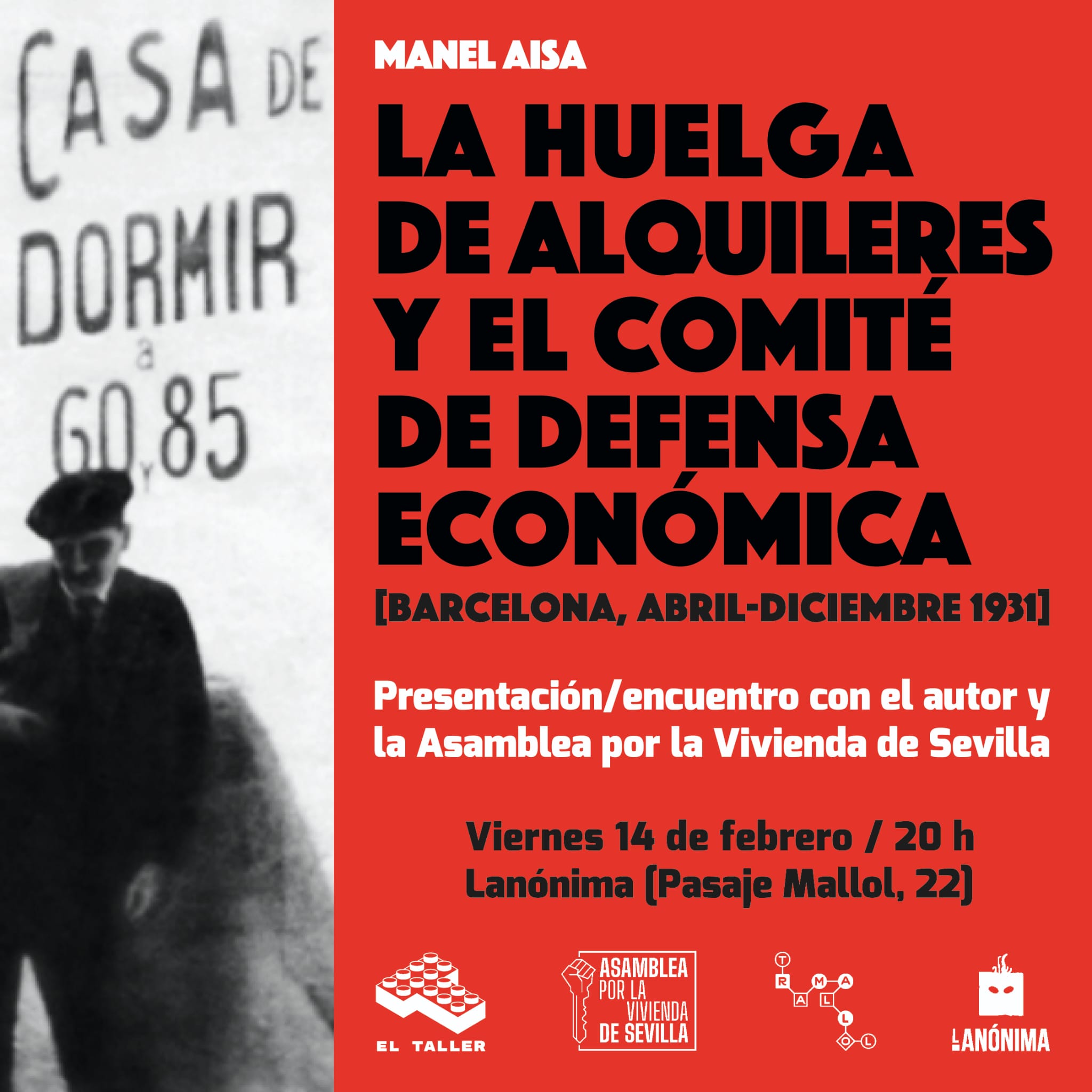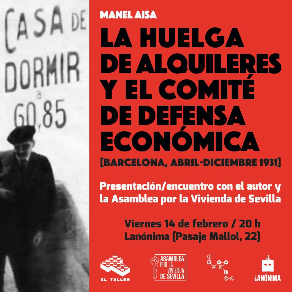El próximo viernes 14 de febrero tendremos en Sevilla a Manel Aisa (Barcelona 1953) presentando la segunda edición de su libro «La huelga de alquileres y el comité de defensa económica», donde el autor rescata y documenta la huelga de alquileres sucedida en Barcelona en 1931, y su contexto social e histórico.