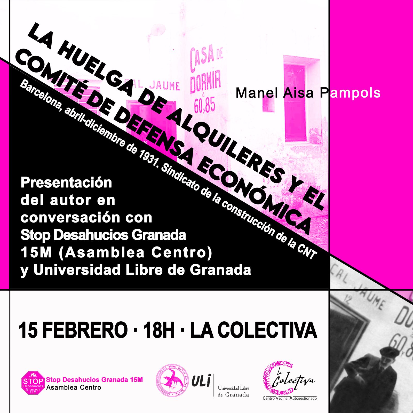 15 de febrero a las 18 horas Centro Vecinal Autogestionado la Colectiva . Presenta Universidad Libre de Granada (ULI ) Conversan con el autro Stop Desahucios Granada 15M.