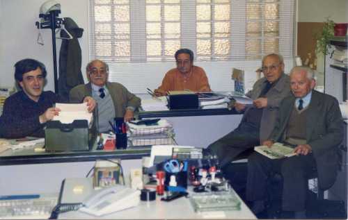 Manel Aisa con Ángel Longarón, Josep Guillamot, Antonio Turón y Fructuoso Garcés todos ellos fueron de las columnas confederales de julio de 1936, aquiu están okupando el despacho del director del CCCB años 90