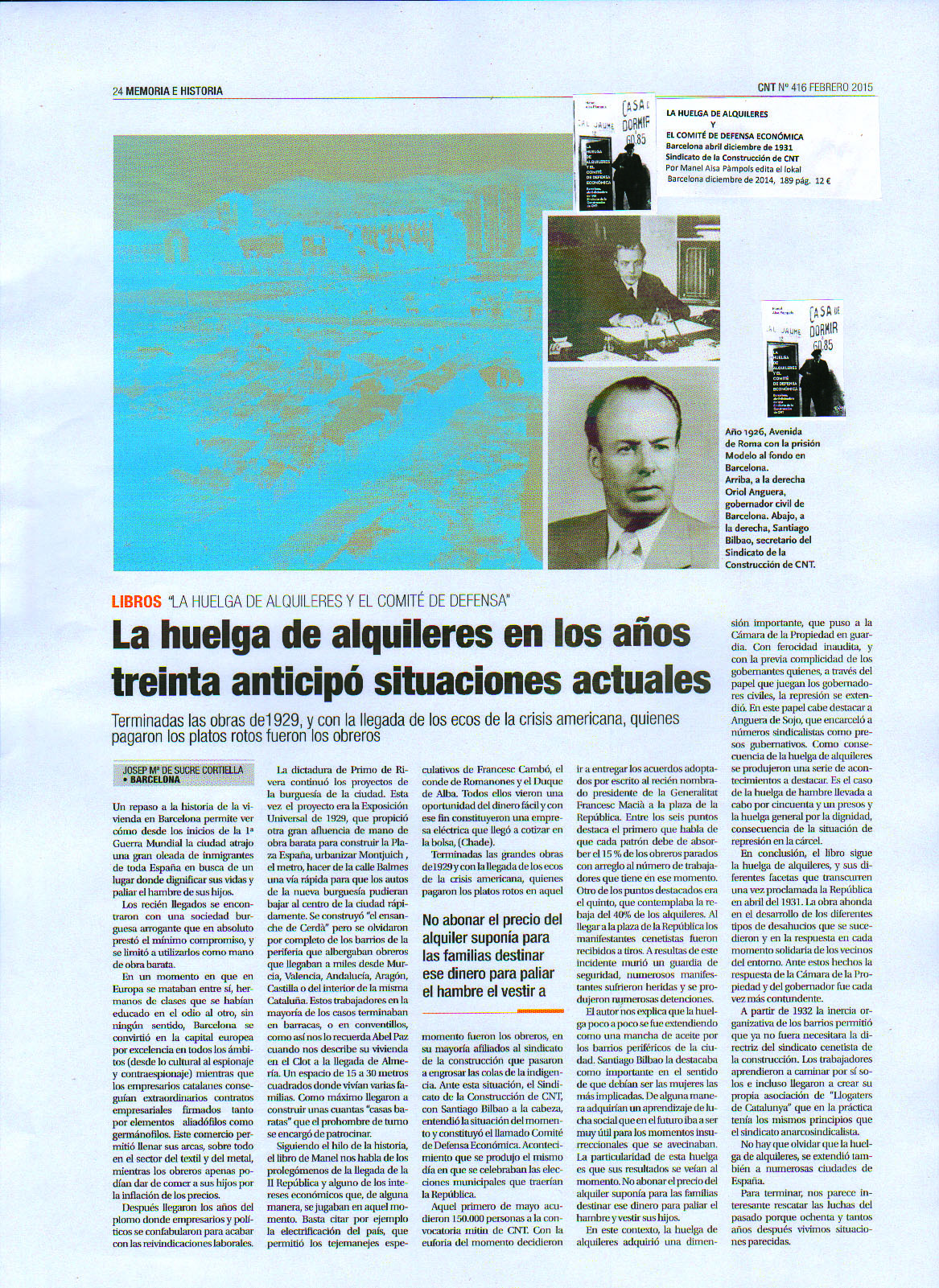 La Huelga de alquileres y el comité de defensa económica Barcelona abril -diciembre 1931 Sindicato de la Construcción CNT artículo publicado en el periódico CNT 416 febrero 2015