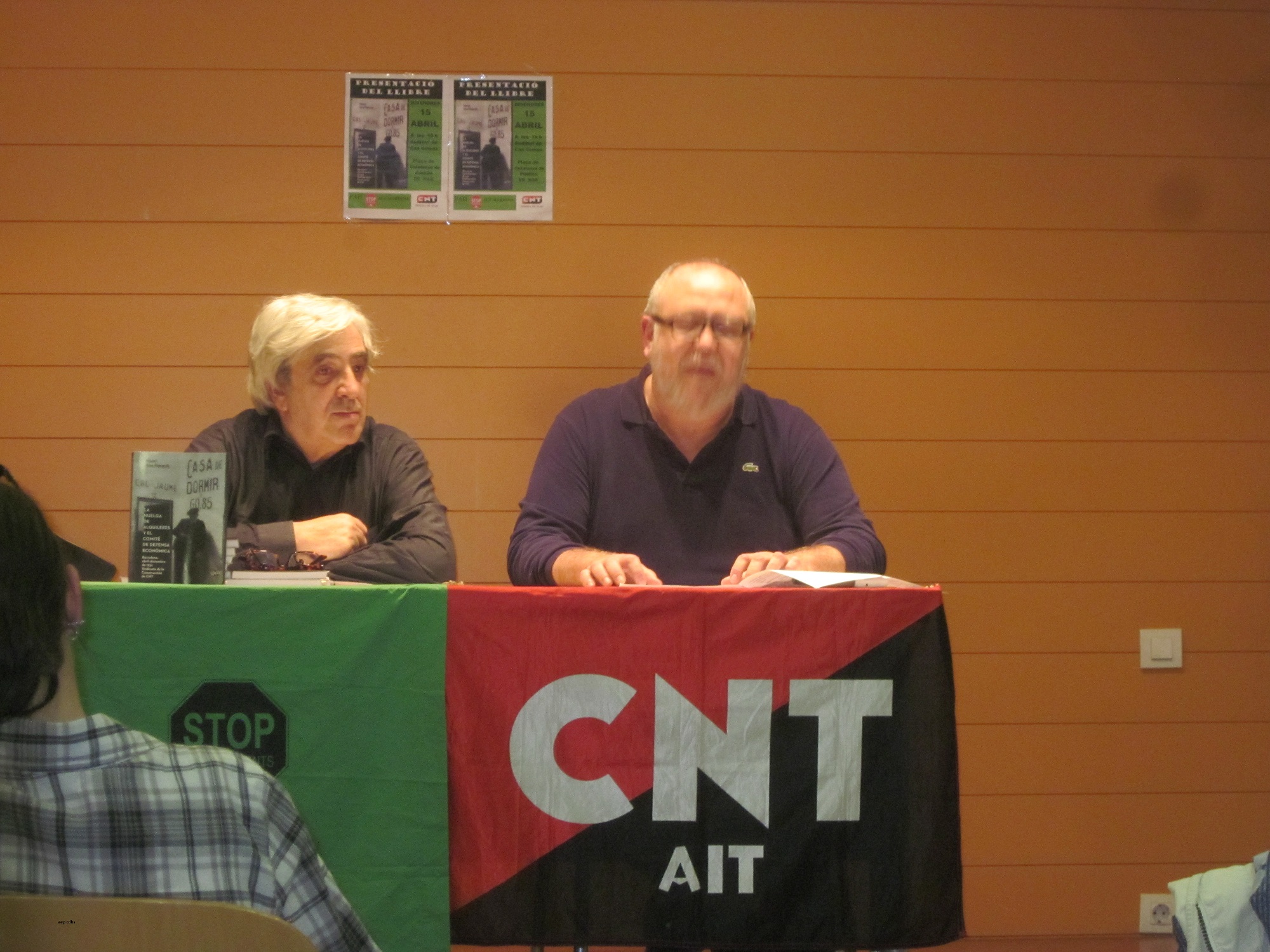 Manel Aisa i Miguel Muliterno presentando el libro del primero «La Huelga de alquileres y el comité de defensa económica Barcelona .. 1931 el 15 de abril de 2016 en Pineda de Mar organiza CNT y PAH de aquella ciudad del Maresme