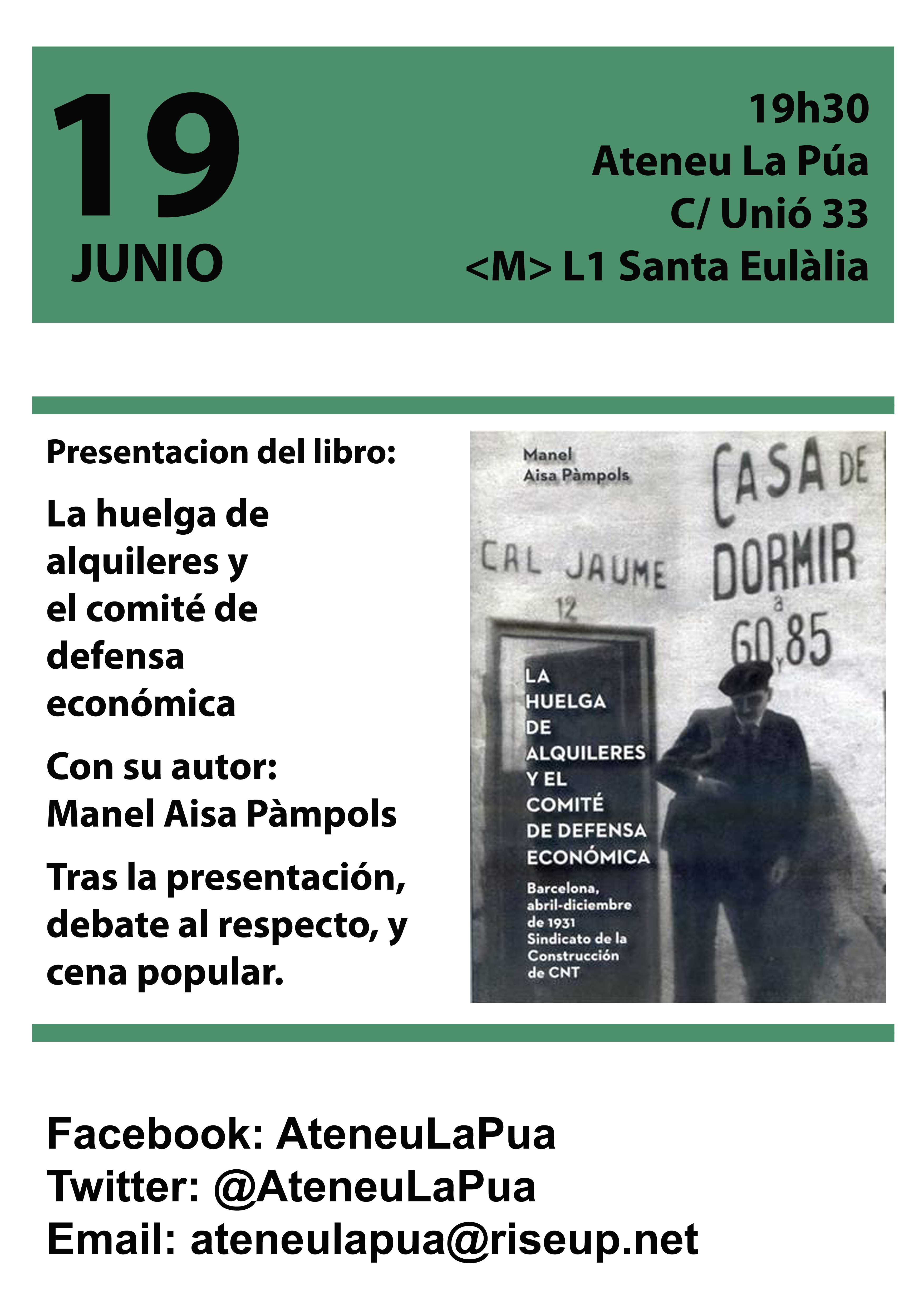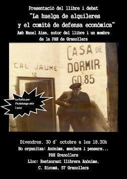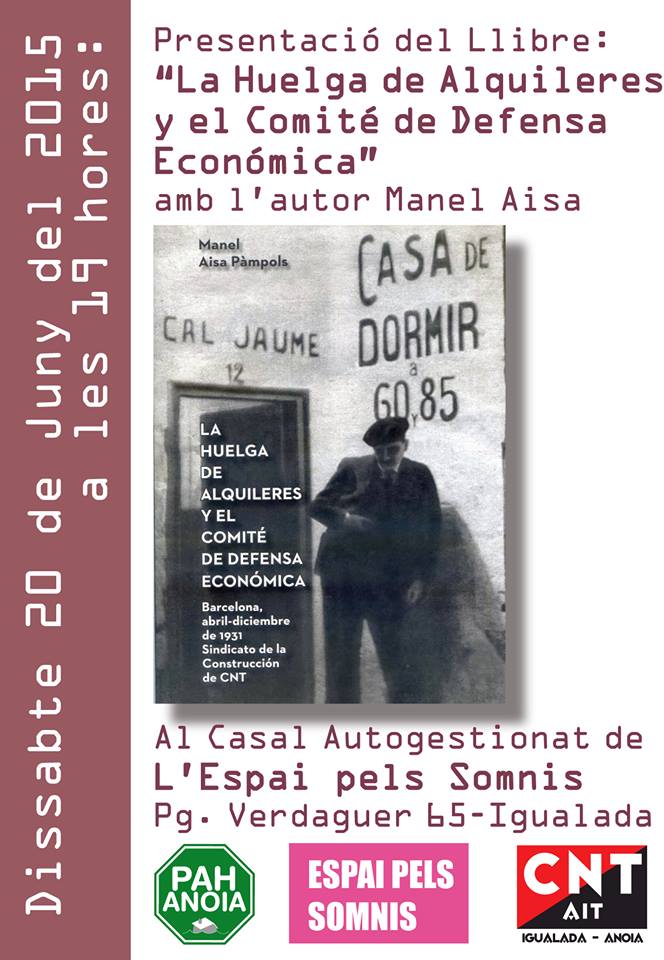 Presentacó Llibre La Huelga de alquileres y el comité de defensa Barcelona abril -diciembre 1931 a Igualada dissabte 20 de juny a les 19 hores lloc casal autogestionat de L`Espai pels Somnis Pg. Verdaguer 65 Igualada