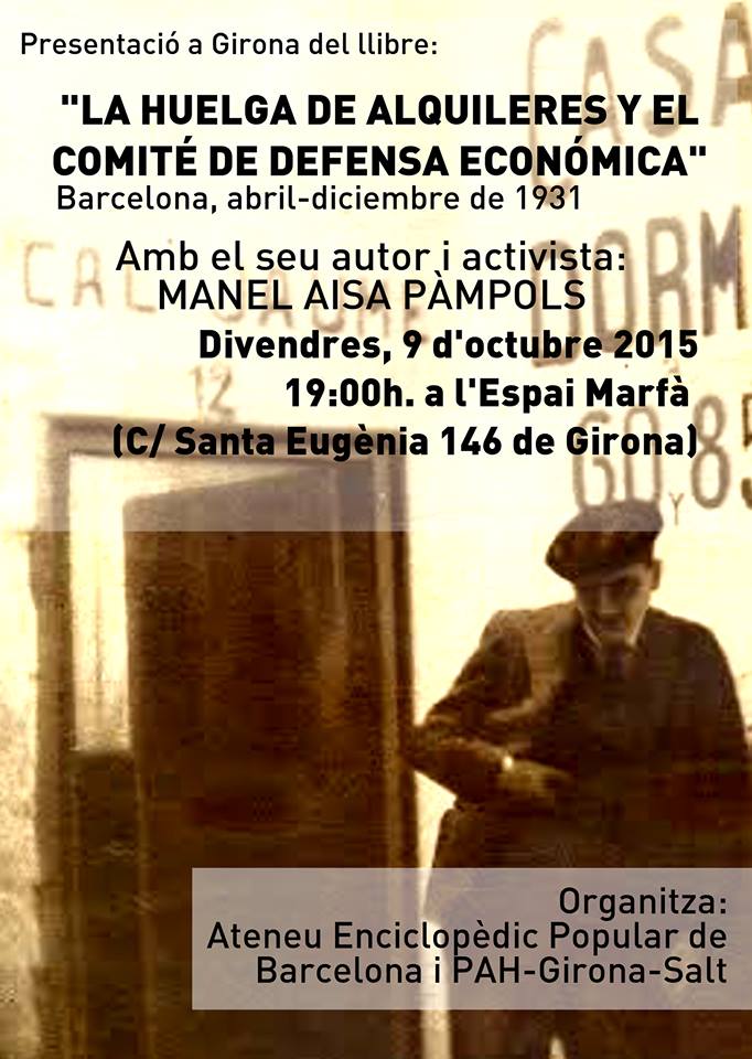 Cartell de la presentació del llibre de «La Huelga de alquileres a Barcelona 1931» a l’ateneu Salvadora Cata de Girona el proper 19 de novembre 2015 us esperem