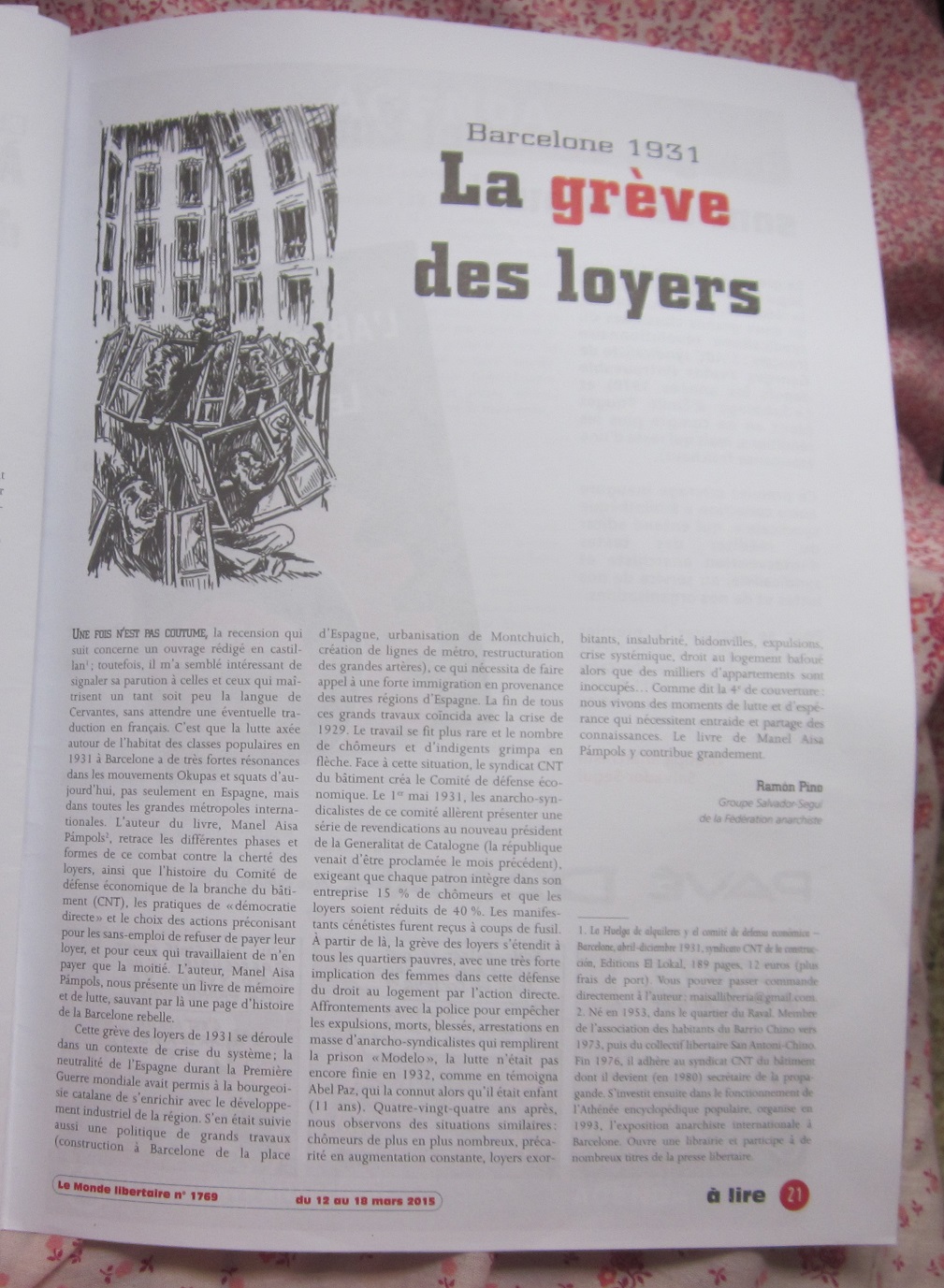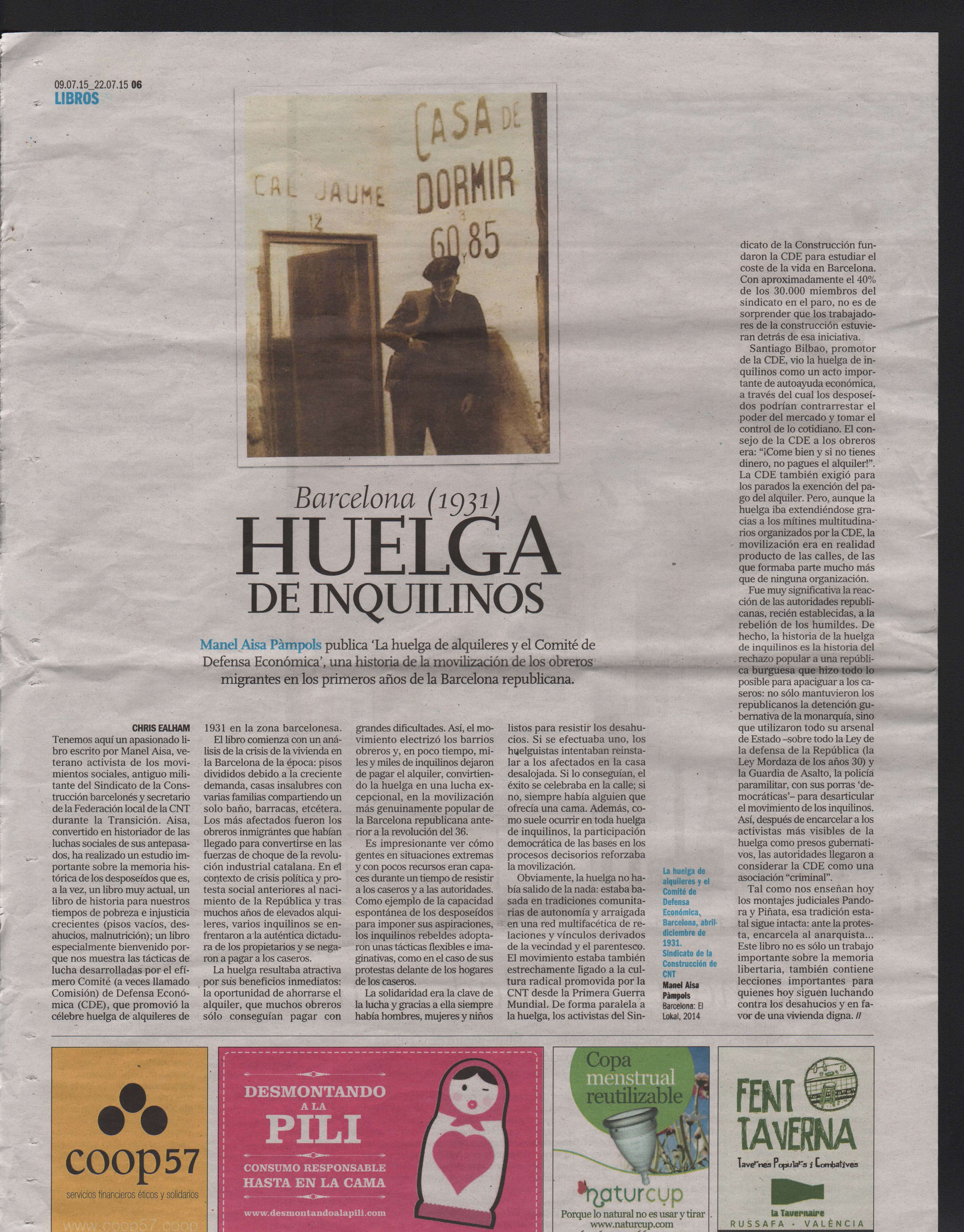 Reseña del libro La Huelga de Alquileres comité de defensa económica Barcelona abril-diciembre 1931 en el periódico Le Monde Libertaire nº 1769 12 au 18 mars 2015 por Ramón Pino La grève des loyers Barcelona 1931