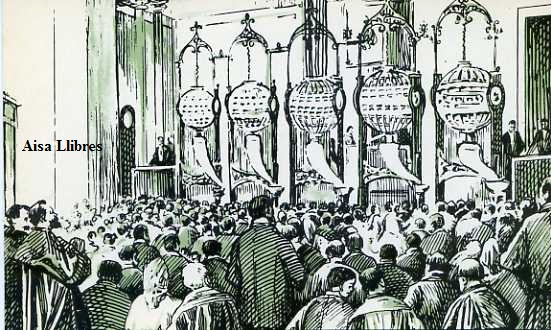 Serie B núm 8 El primer sorteo de irradiación celebrado en España Dibujo de Picolo 1888 Dirección General de Tributos especiales FNMT Madrid s/f (años 60) 6 €
