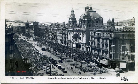 Postal Barcelona 80 Avenida de José Antonio, Coliseum y Universidad. Ed. Oriol s/f con ventanilla 1929 probablemente 9 €