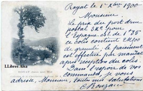 Royat dans son Nid Collection de la Chocolaterie de Royat nº 1 escrita por la parte delantera y fechada 1 -10 1900. Sello Republique Francaise 10 30 €