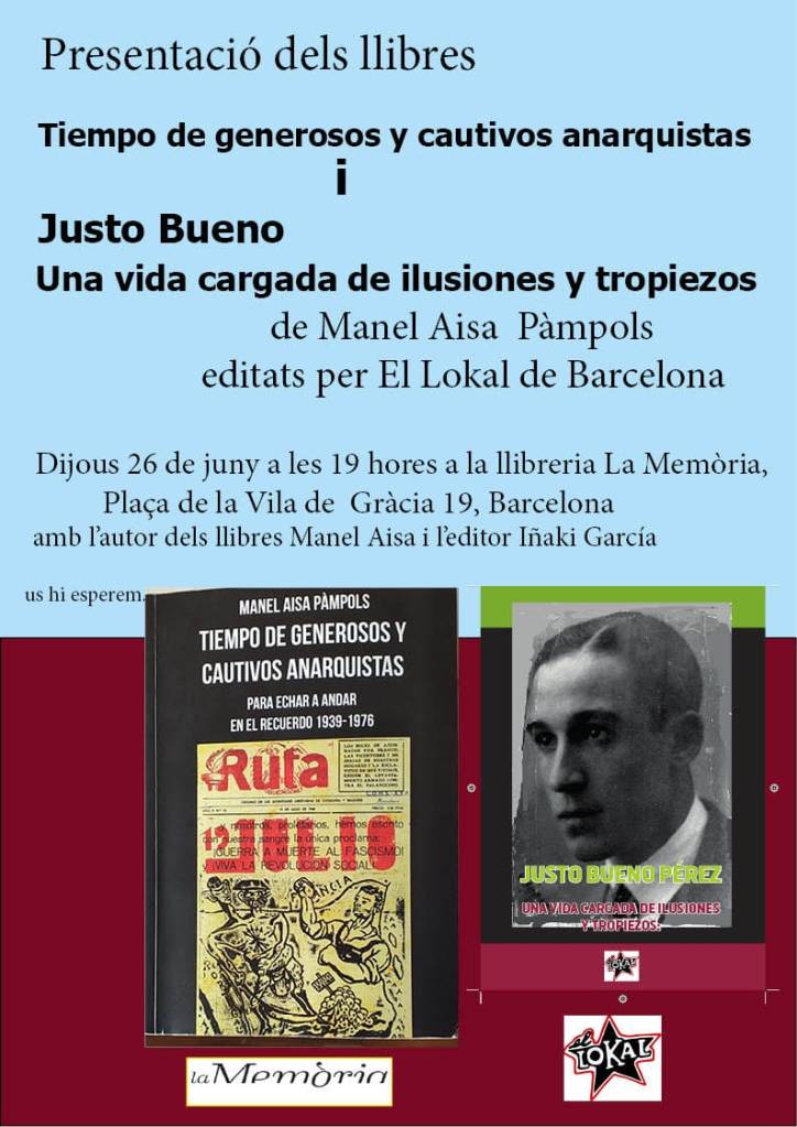 Ahir a la llibreria “La Memòria” de la plaça de la Vila de Gracia núm. 19 i acompanyat per Iñaki Garcia l’editor crec que la presentació va tenir una correlació de sintonies en el discurs que va donar peu a pensar en molta de les persones que havíem conegut que d’alguna manera ens han portat en tot aquest camí fins a l’avui en el record, i d’alguna manera rescatar la seva memòria per arribar a estimar-la tal com eren en Liberto Sarrau, Concha Pérez, Concha Liano, Diego Camacho, Enric Casanyes, Ada Martí Vall, Eduard Pons Prades, Miguel García García, Domingo Ibars, Luis Andrés Edo, i Alberola i la seva companya Adriadne Grancsac, que encara viuen, però ja amb molta edat en una residència a França.