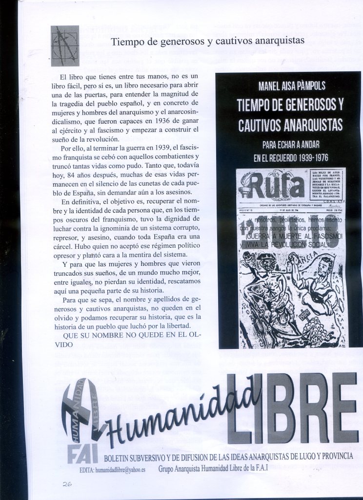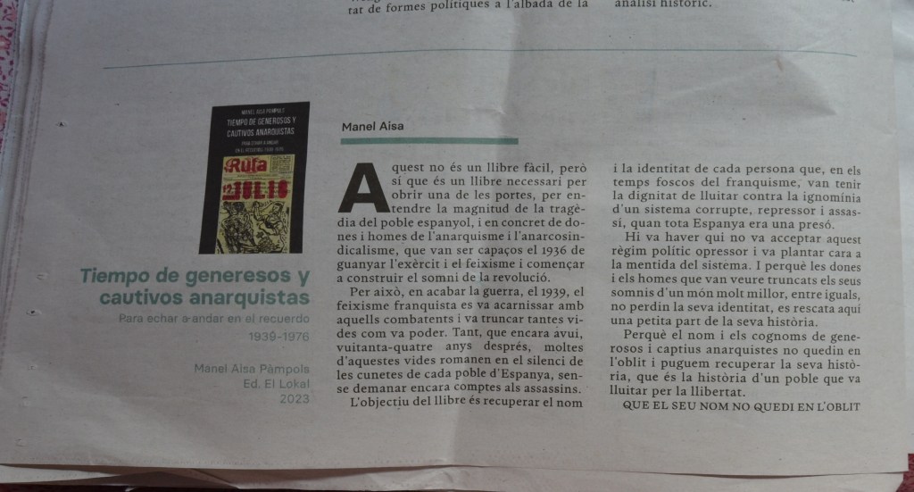 retalls de premsa sobre Tiempo de generosos y cautivos anarquistas de Manel Aisa