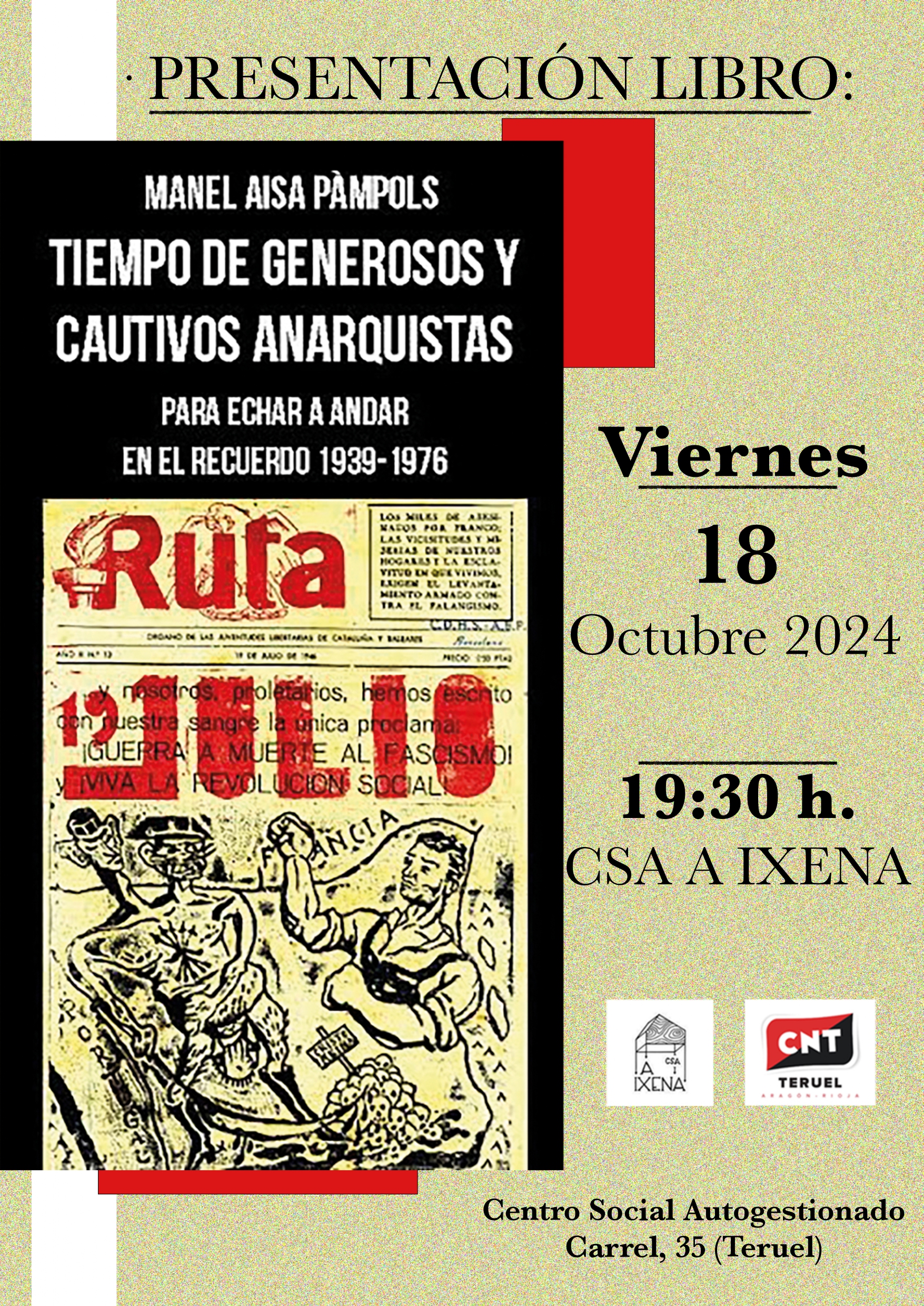 El pròxim 18 d’octubre d’enguany estaré a Terol , per parlar d’aquells extraordinaris anarquistes que van lluitar fins a l’últim alè per construir un món molt millor i es van trobar amb la Barbàrie feixista del franquisme i els seus aliats nazis i camises «pardas» dels italians de Mussolini, amb les blaves del falangisme.