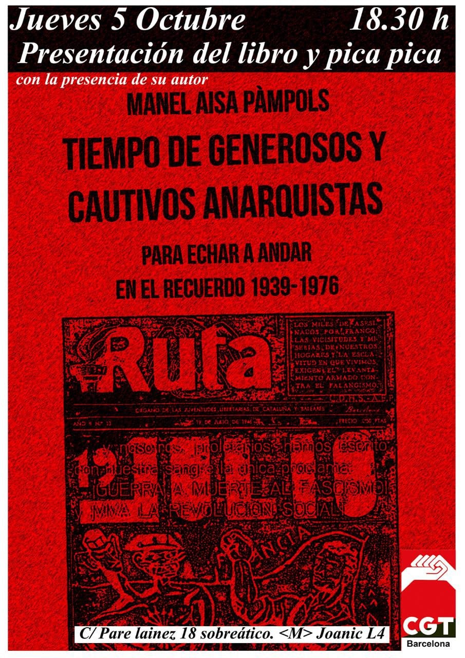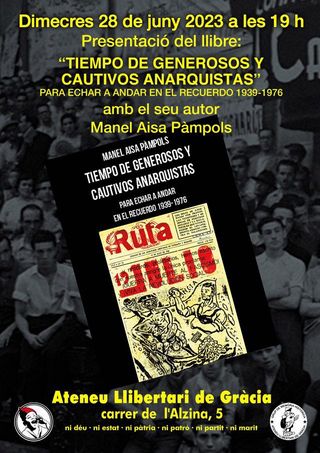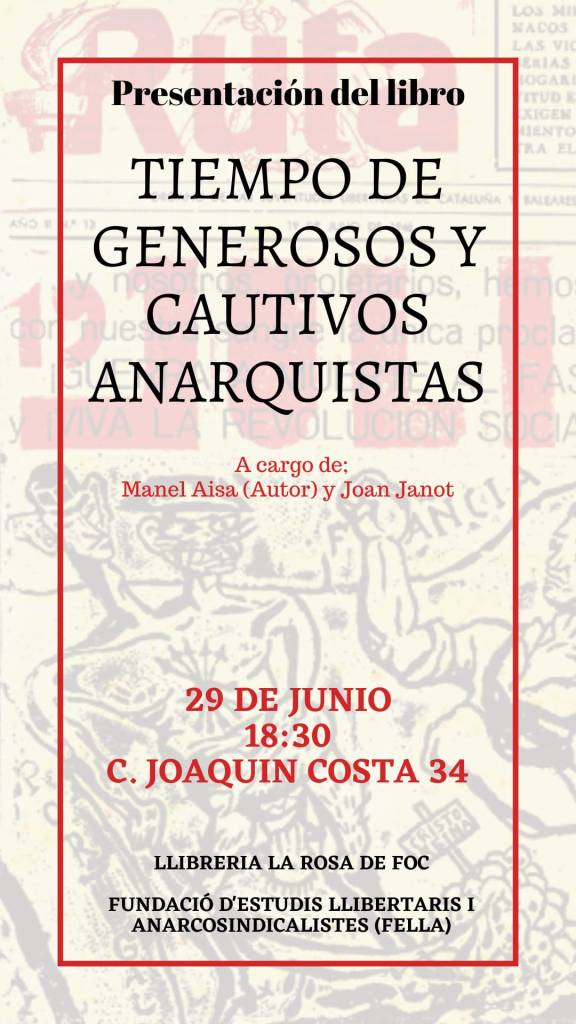 Parlo del llibre publicat recentment pel Lokal «Tiempo de generosos y cautivos anarquistas», en aquestes dues, presentacions, m’he dedicat a parlar una mica de les persones i també companys, d’idees, que van donar la vida, vist des d’ara, poc menys que per res, van ser com enganyats.