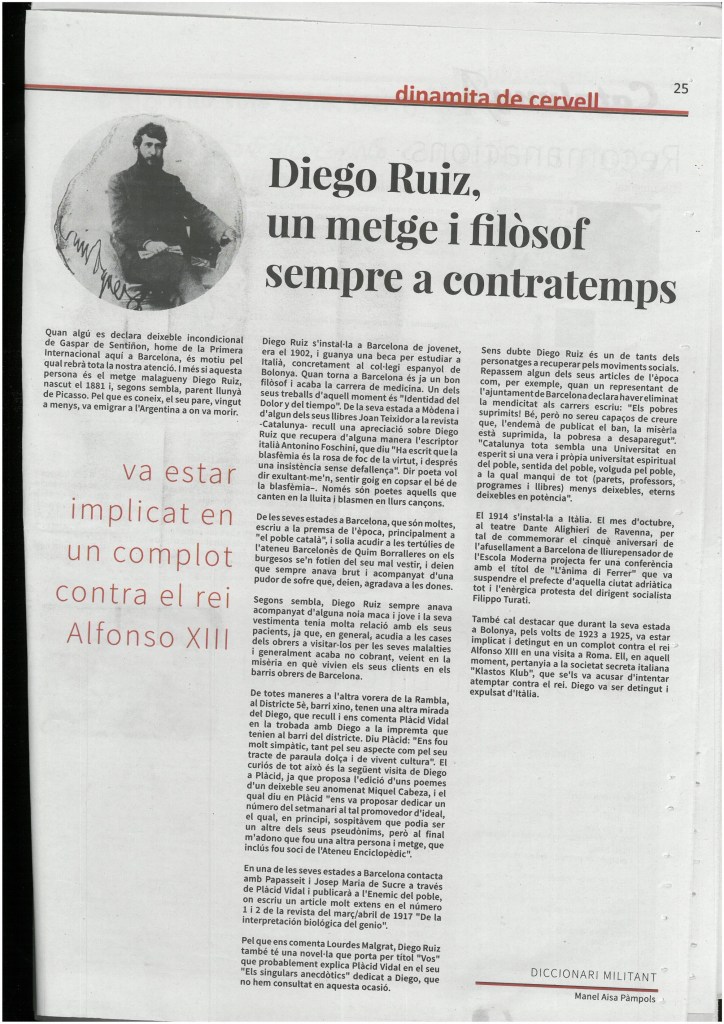 Diego Ruiz l’any 31 dedica el seu llibre «El crim dels Reis Catòlics» a Gaspar de Sentiñon aquell metge de la primera internacional del qual es declara fill i deixeble i va arremetre contra tots els seus conciutadans barcelonins per haver-lo oblidat. Un altre de les seves frases que avui podem entendre molt bé diu: «El català té una missió llibertària antiprogro, que contrasta amb la mentalitat castellana unitària i religiosa».